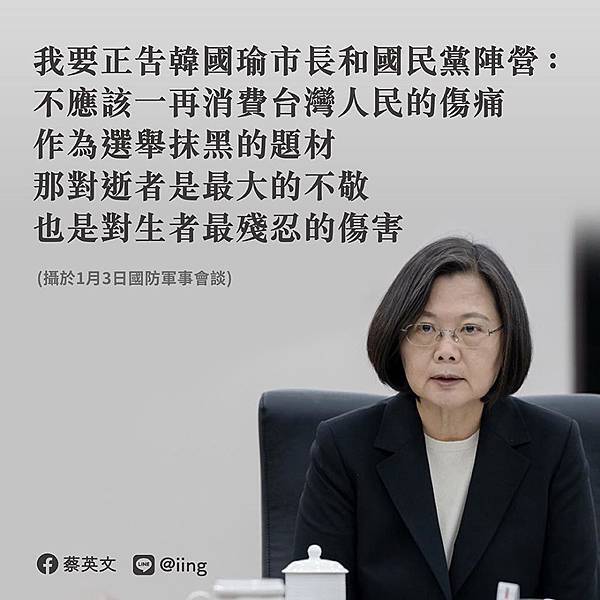 當蔡總統努力安撫民情,穩住軍心,不讓敵國有可趁之機;韓幫藍黨卻忙著「中邪」,消費英烈,造謠中傷。可見韓草包無肝無肺,良心被狗吃了,才會想借國家的傷痛來詐取選票。相對於韓導的卑鄙下作,忠厚良善的小英真的值得國人投她一票。
